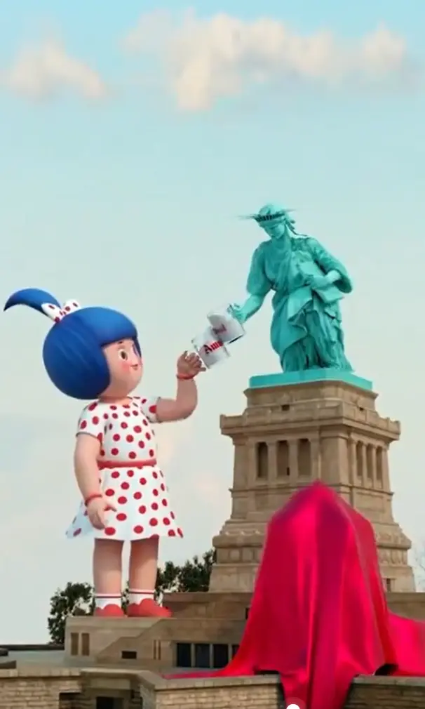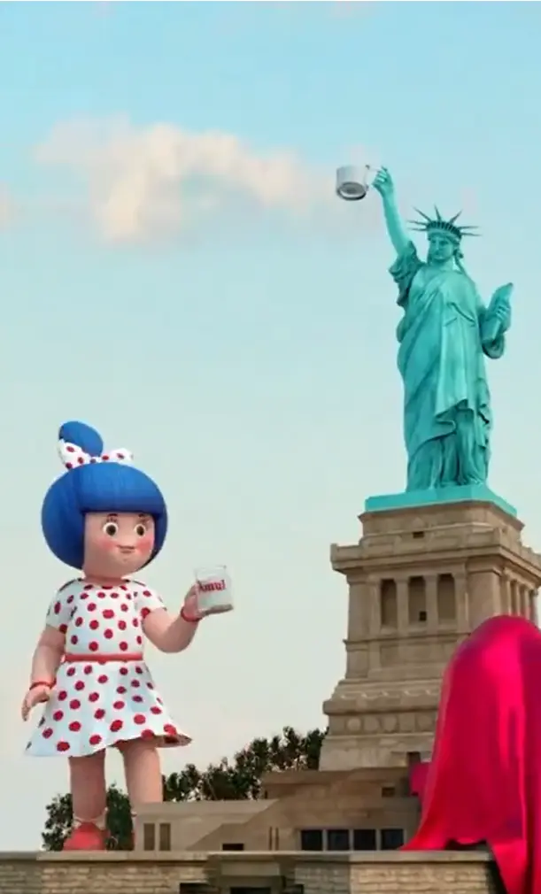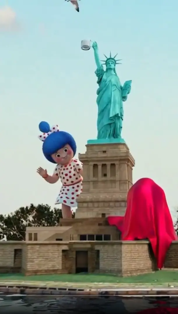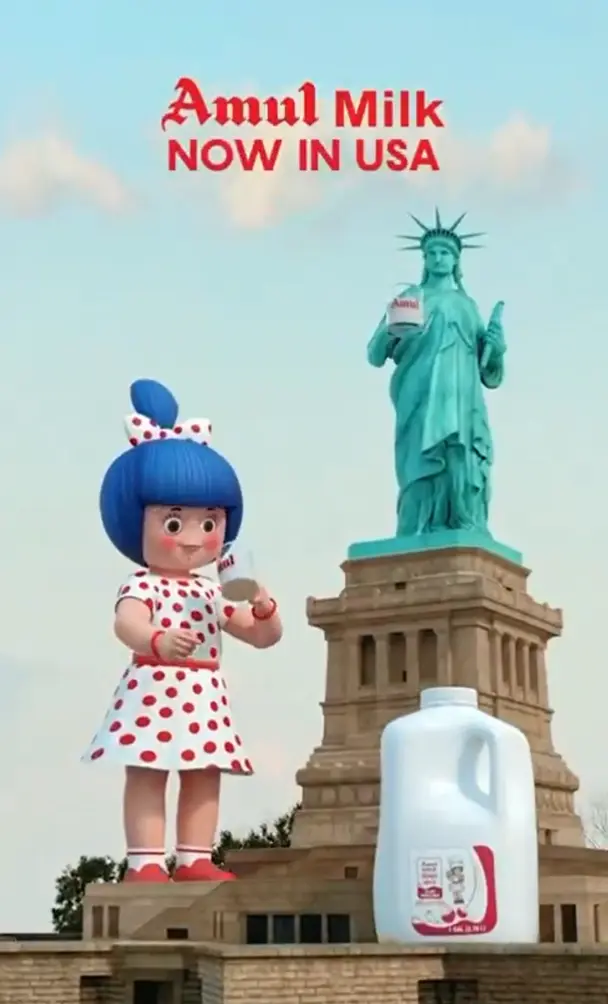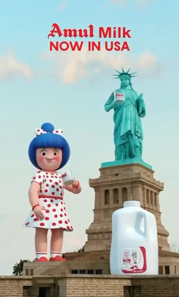 The ad campaign utilizes charming CGI (3D) animation that shares a cup of milk between Amul Girl and Statue of Liberty.