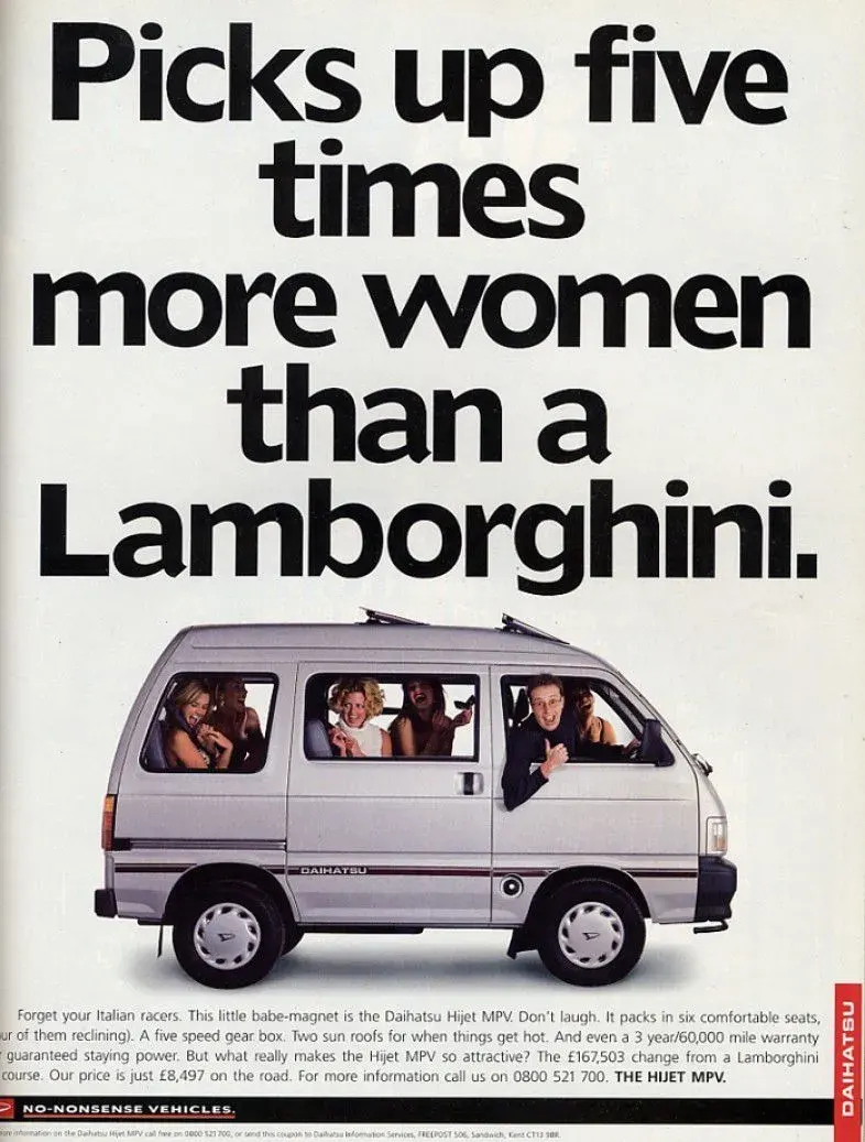 The 1996 Daihatsu Hijet MPV print ad is remembered for its audacious tagline: “Picks up five times more women than a Lamborghini.” This bold statement immediately grabbed attention and challenged the conventional wisdom that expensive sports cars were the ultimate status symbols for attracting attention.