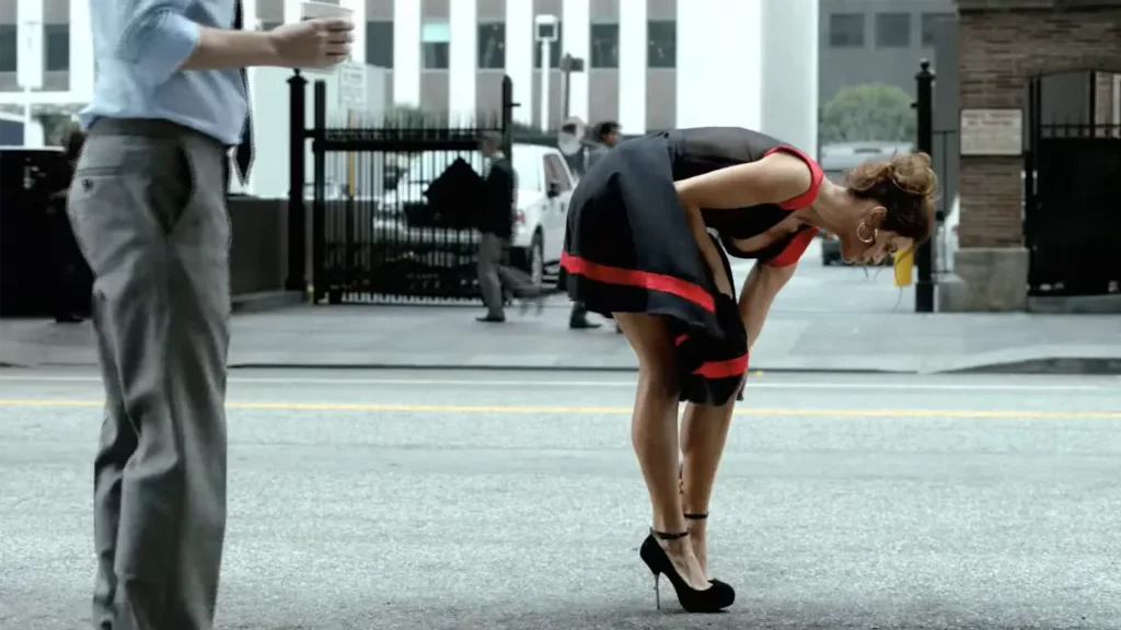 - A young man is walking down a street when he stops, mesmerized by a beautiful woman in a black and red dress (played by Romanian-Italian supermodel Catrinel Menghia) who is bent over adjusting her shoe.