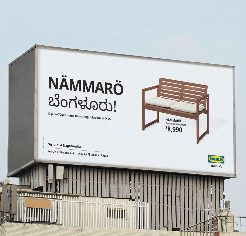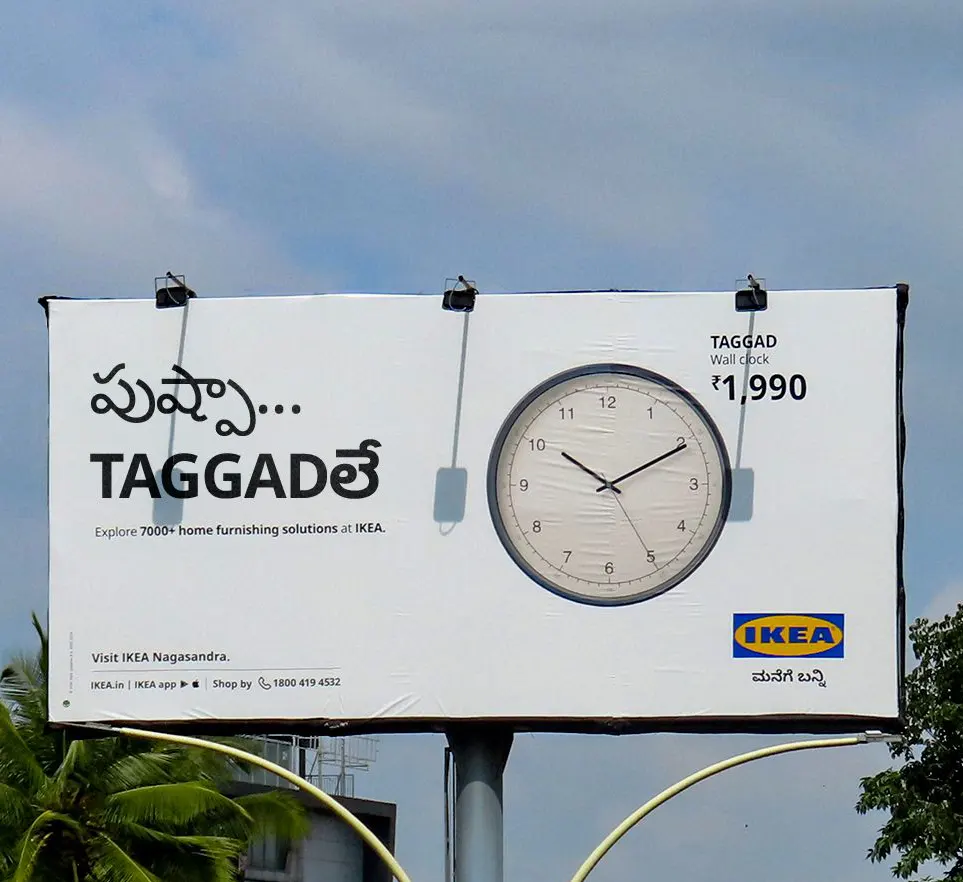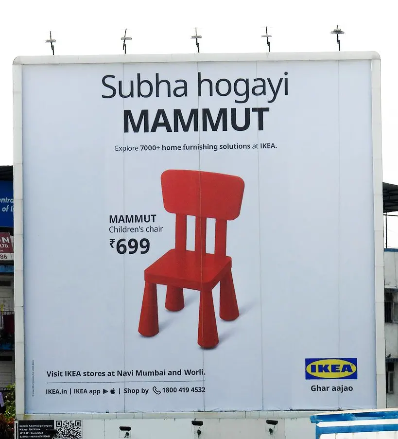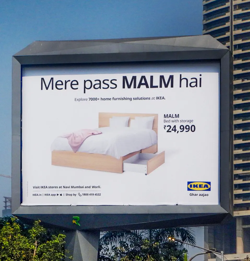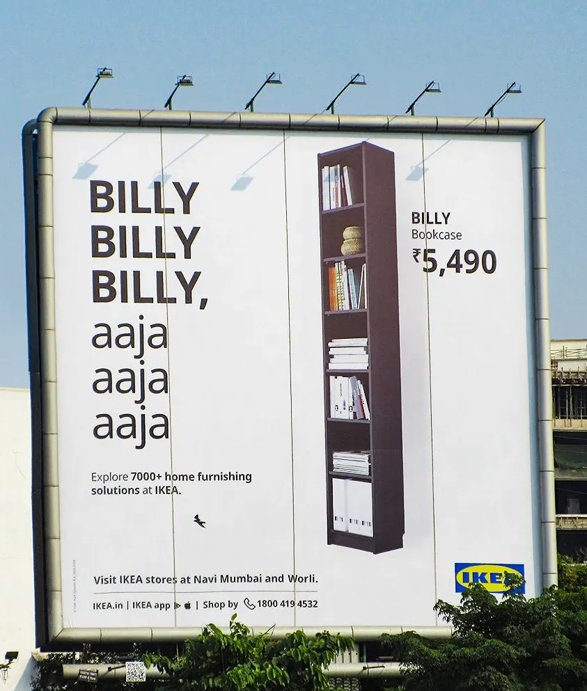 The campaign featured a series of billboards and displays that cleverly paired popular movie dialogues with the names of Ikea products. For example, one ad used the famous line “BILLY, BILLY, BILLY; Aaja, Aaja, Aaja” (referencing a song from the movie “Jumana”) alongside the Ikea BILLY bookshelf. Similarly, other ads used references like “TAGGADeley” (meaning “hurry up” in Hindi) for a clock or “Mungaru MALM e” (a play on the song “Mungaru Malhar” and the MALM dresser).