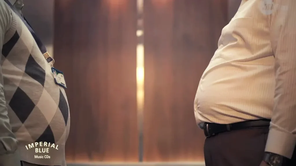 The commercial takes place in a typical office building elevator. Two middle-aged, formally dressed men are in an elevator with a beautiful young woman (Patani). Throughout the ride, the men maintain perfect posture and visibly suck in their stomachs to look fit and impressive. As soon as she exits the lift, both men instantly exhale in relief, letting their bellies hang out again, and share a knowing high-five. The iconic “Men Will Be Men” ghazal plays in the background, punctuating the moment
