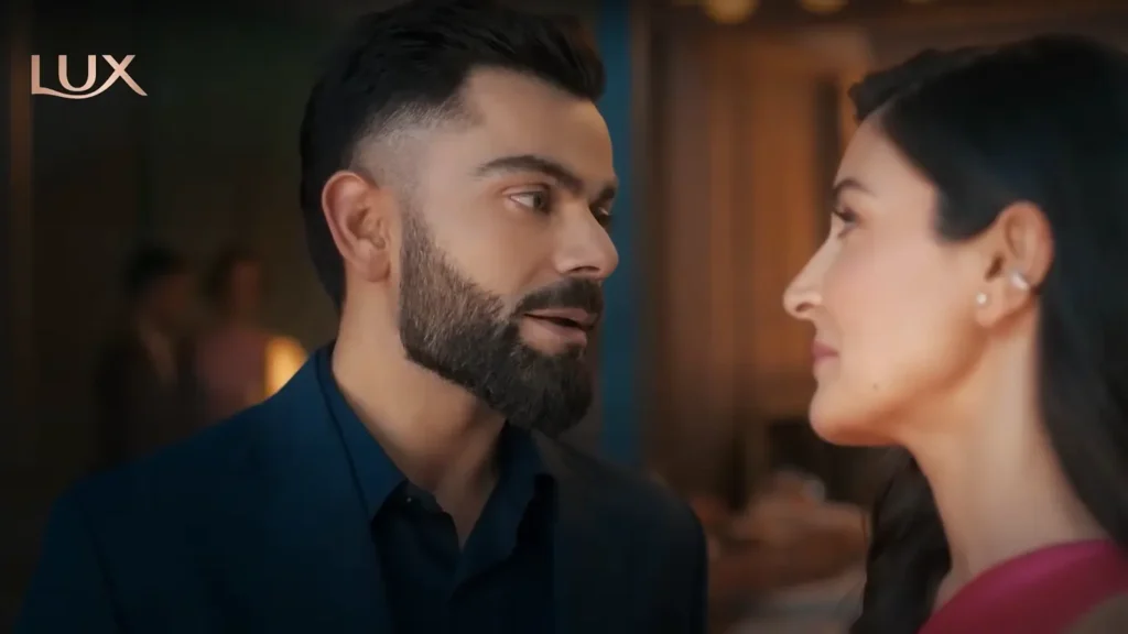 Lux India’s Flawless Glow campaign, featuring the popular celebrity couple Virat Kohli and Anushka Sharma, focuses on the captivating power of radiant skin. The ad unfolds at a party where Virat is visibly mesmerized by Anushka’s glowing complexion.