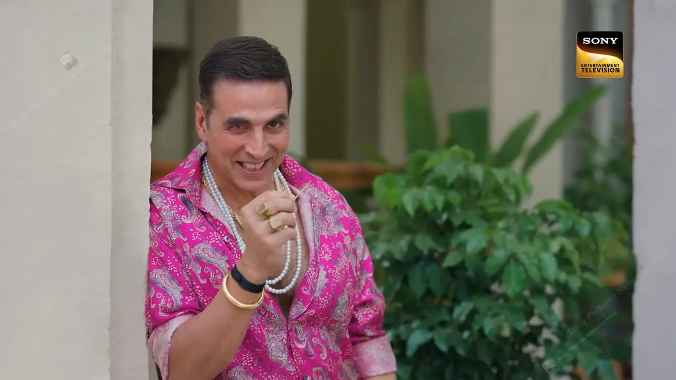 - Akshay transitions from the servant role to a millionaire persona, sporting a bright pink shirt and a large diamond chain, before stepping onto a neon-lit Wheel of Fortune stage.