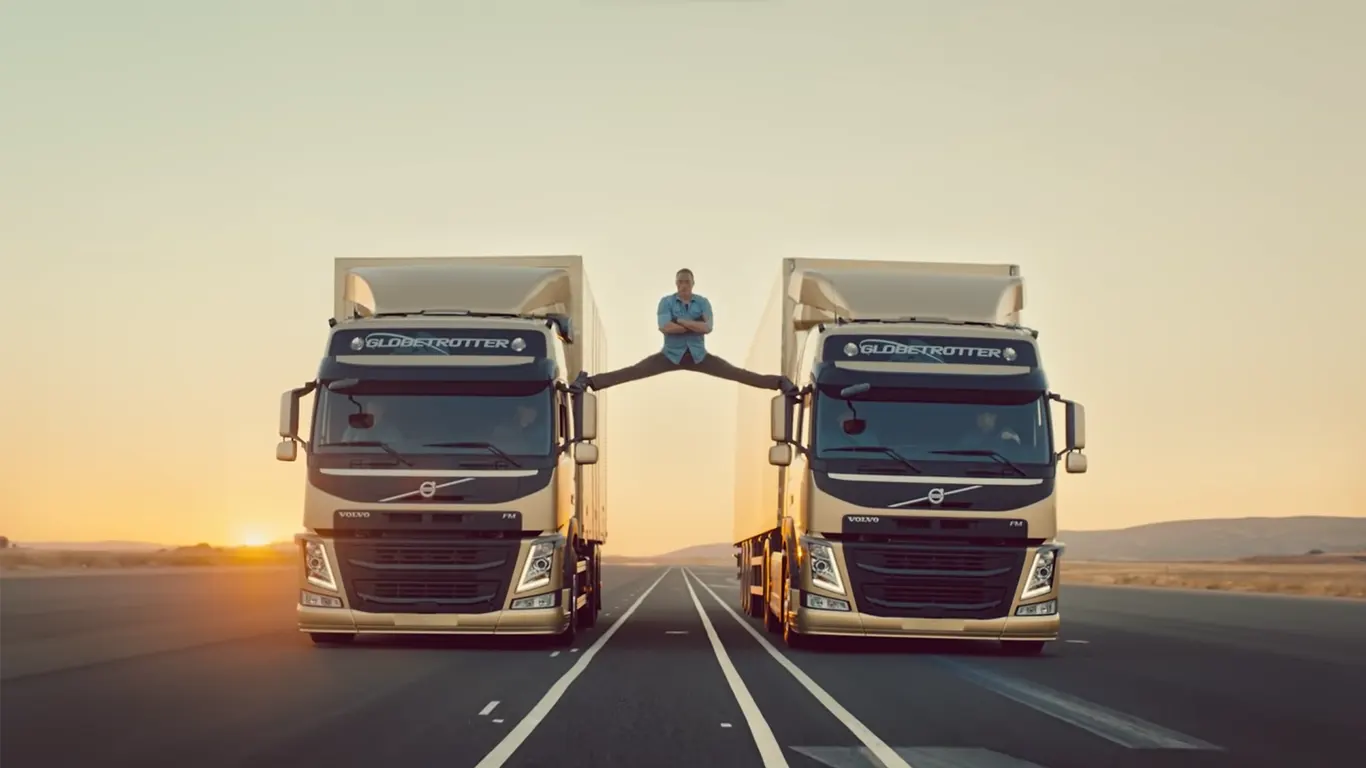 The ad opens with Van Damme standing between two Volvo FM trucks slowly reversing away from each other. As the tension builds, he performs a perfect split, his feet resting on the mirrors of each truck.